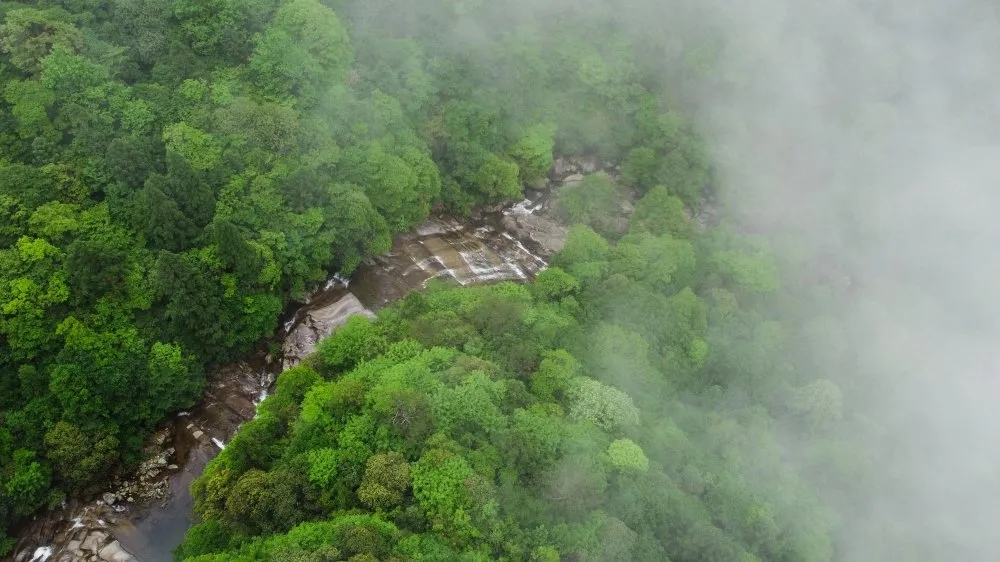 村庄、山川、树木、山花在云雾中时隐时现