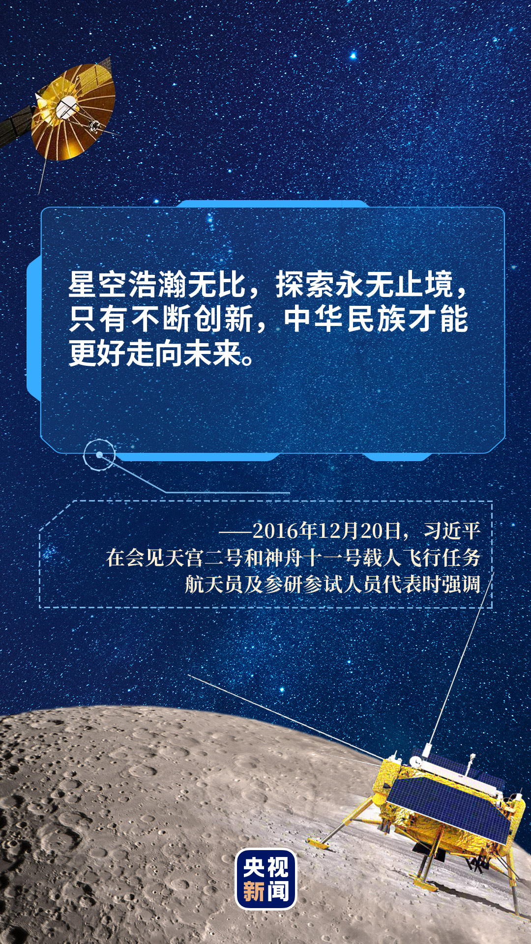 太空探索永无止境,追梦之路永不停歇。 站在新的历史起点,中国航天工作者仰望星空、脚踏实地,在奋力奔跑中探索星空,在逐月之路上砥砺前行,力争创造新时代中国星空探索的更大奇迹。