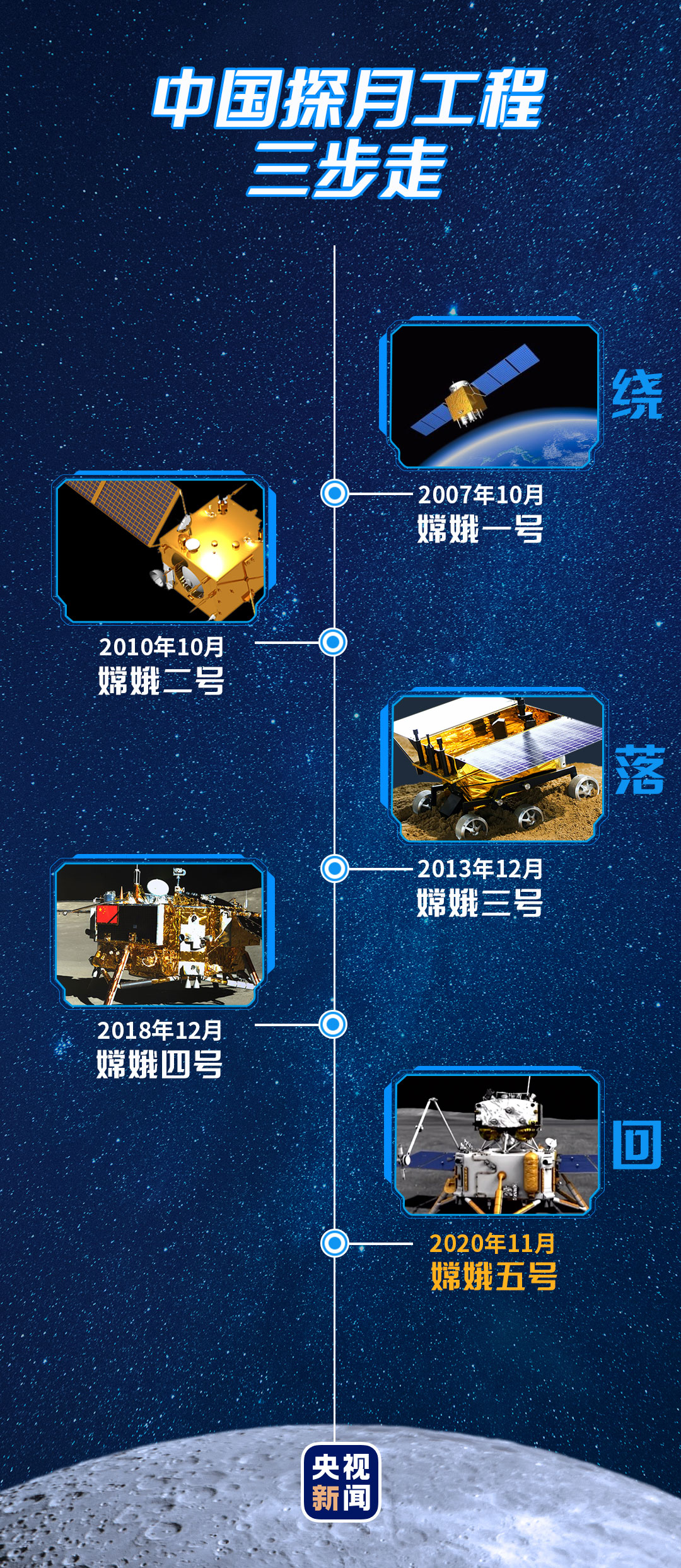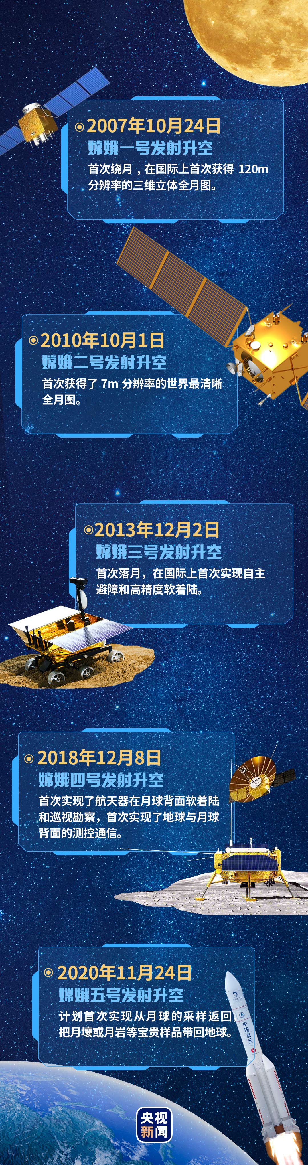 自2004年1月立项并正式启动以来,我国探月工程已连续成功实施嫦娥一号、嫦娥二号、嫦娥三号、再入返回飞行试验和嫦娥四号等五次任务。 月面软着陆探测、月面巡视探测、近第二宇宙速度月地返回、月背探测……一系列世界级月球探测工程难题接连被攻克,一个个惊喜时刻令人印象深刻。