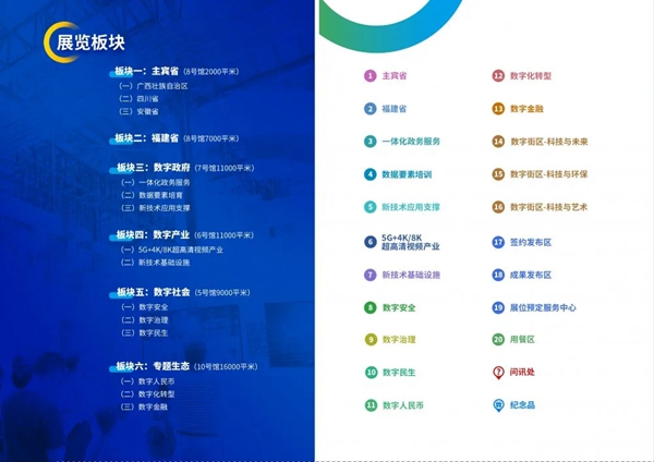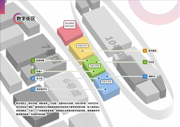 展览板块及展区分布 本届展览会规划了六大板块、数字街区以及诸多功能区。