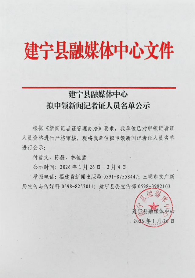 建宁县融媒体中心拟申领新闻记者证人员名单公示